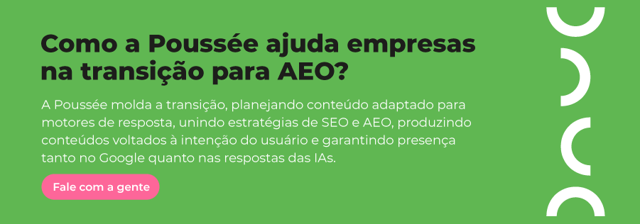 Como a Poussée ajuda empresas na transição para AEO? A Poussée molda a transição, planejando conteúdo adaptado para motores de resposta, unindo estratégias de SEO e AEO, produzindo conteúdos voltados à intenção do usuário e garantindo presença tanto no Google quanto nas respostas das IAs.