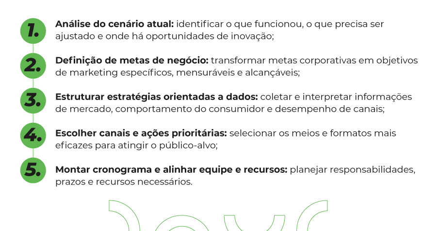 - Defina objetivos claros: conecte metas de marketing às metas corporativas e use SMART goals para direcionar cada ação;