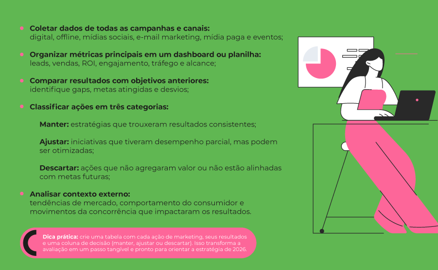Para iniciar o planejamento de marketing de 2026, é preciso mapear de forma prática o que funcionou e o que não trouxe resultados no último ano. A avaliação deve ser orientada por dados, métricas-chave e análise crítica de todas as ações realizadas, permitindo decisões objetivas para o próximo ciclo.