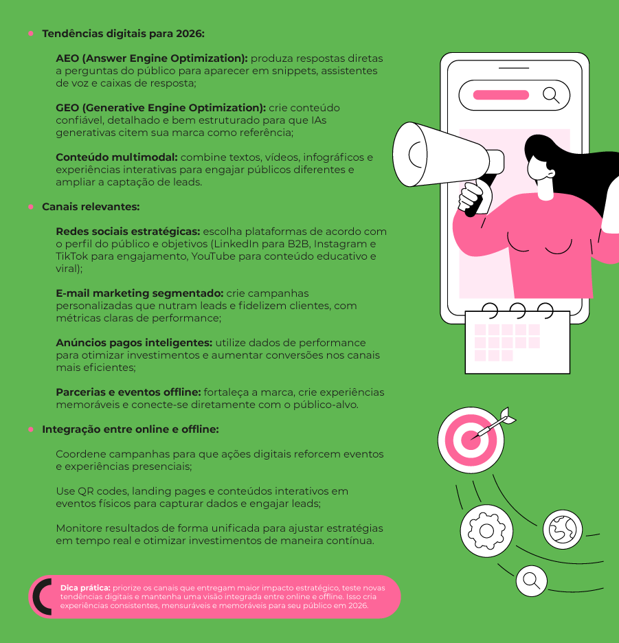 - Priorize canais e ações relevantes: integre online e offline, considerando tendências digitais, AEO, GEO e conteúdo multimodal;