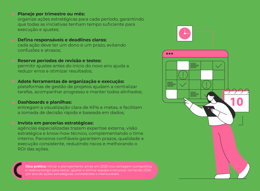 - Monte um cronograma e alinhe equipe e recursos: planeje ainda em 2025, organize ferramentas, defina responsabilidades e aproveite parcerias estratégicas com a Poussée.